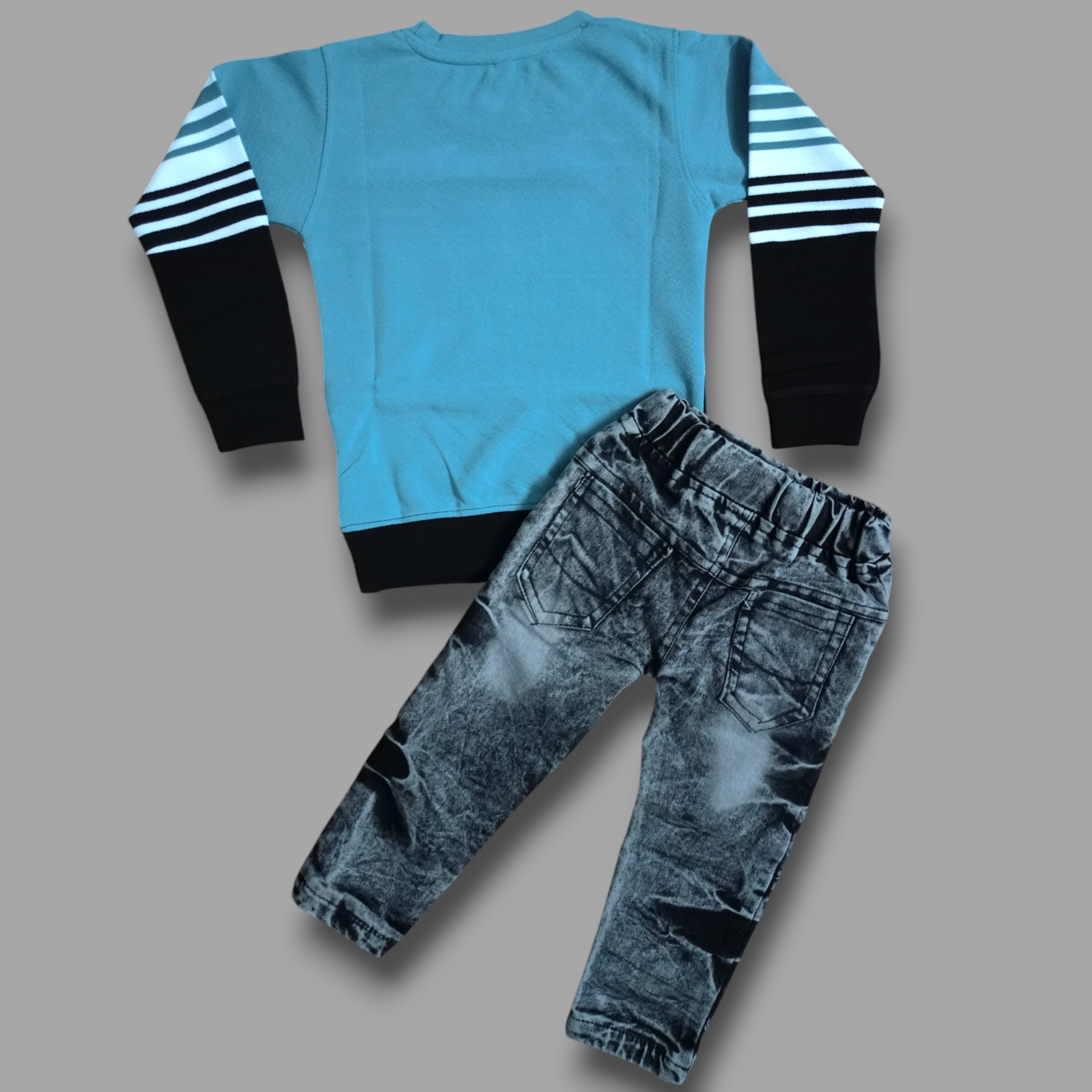 Upgrade your little one’s wardrobe with this stylish boys' outfit, featuring a sky full-sleeve T-shirt paired with classic denim jeans. Made from premium fabric, it ensures comfort and durability for everyday wear. Perfect for casual outings, playdates, or any occasion!